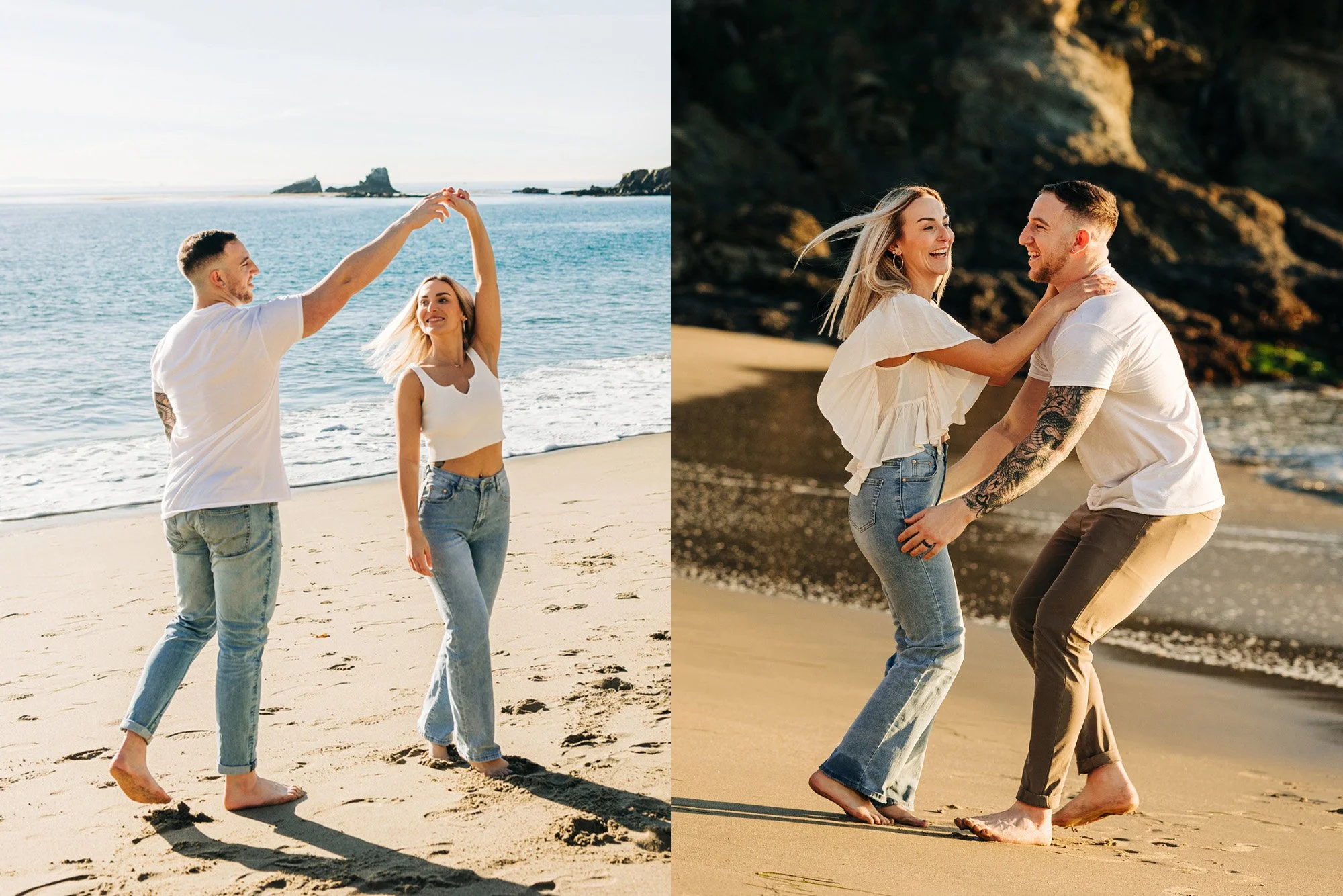 Jeans on the beach makes for a casual and playful vibe.