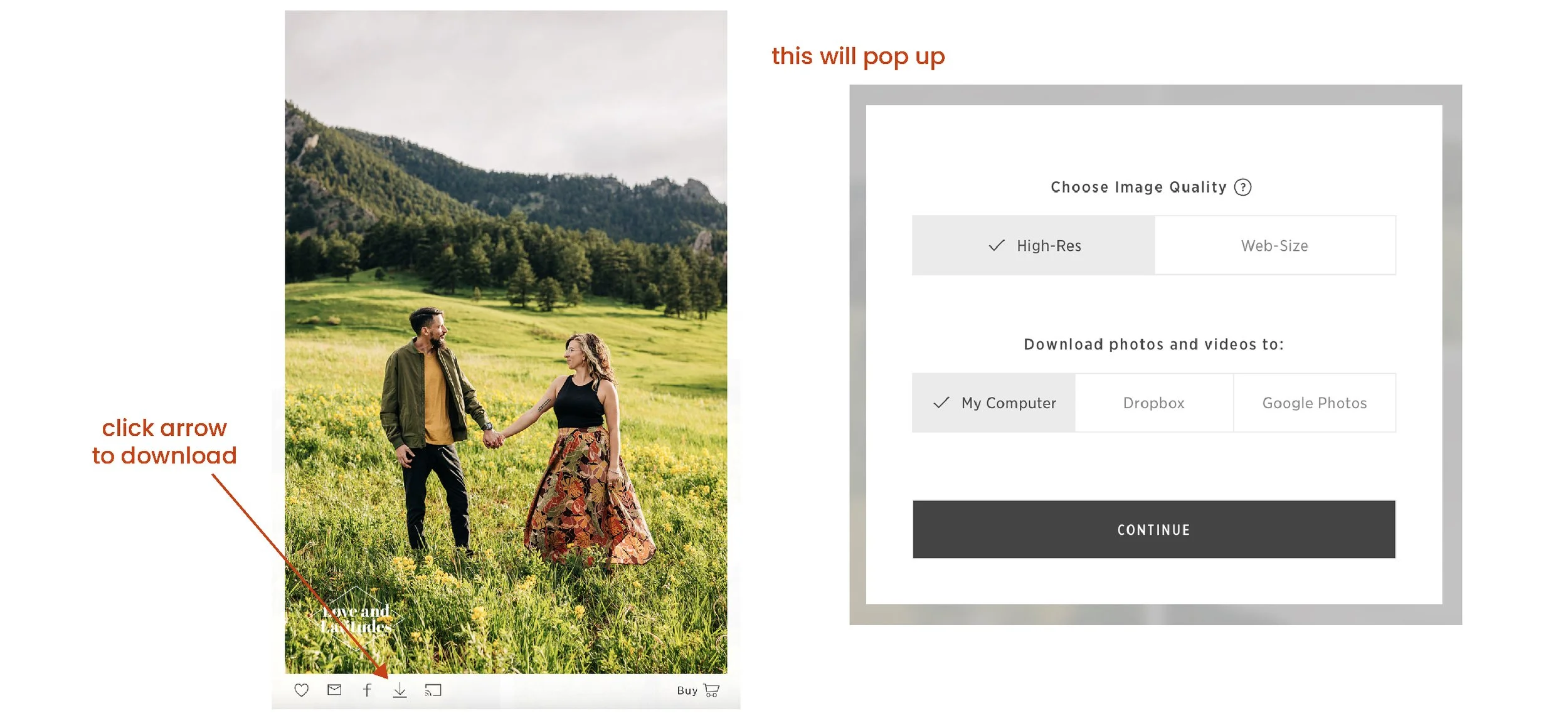 You can download one image at a time by clicking on the image, then clicking the downward arrow. A pop-up will show, where you can choose to download high- or web-resolution photos and where to download them to. More on that soon.