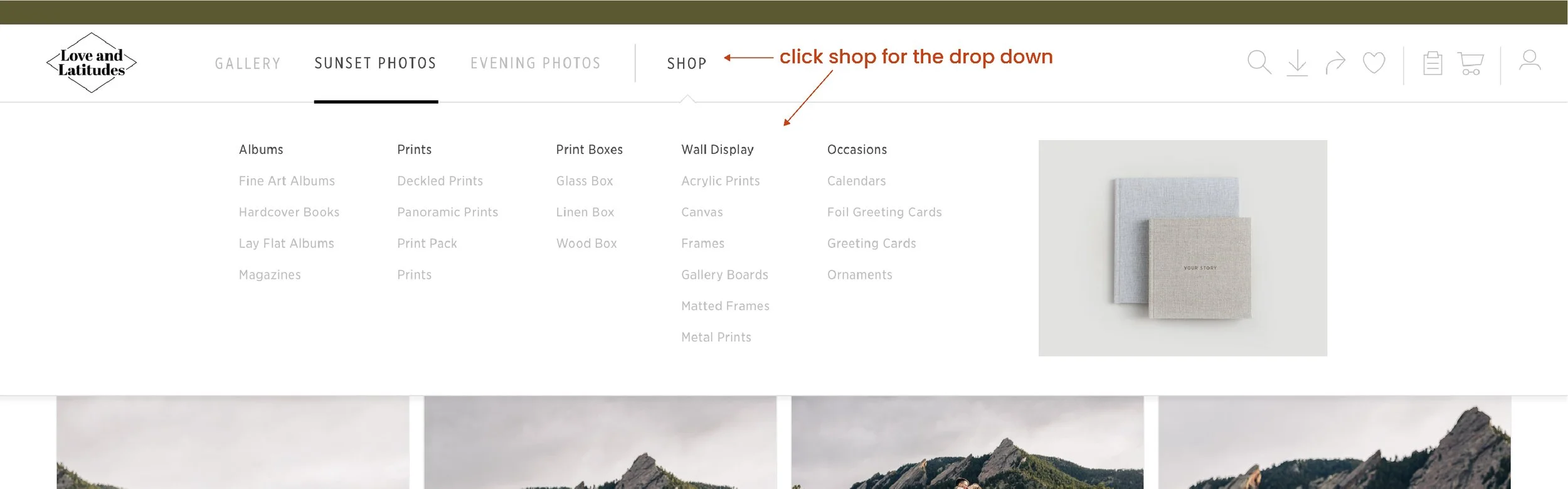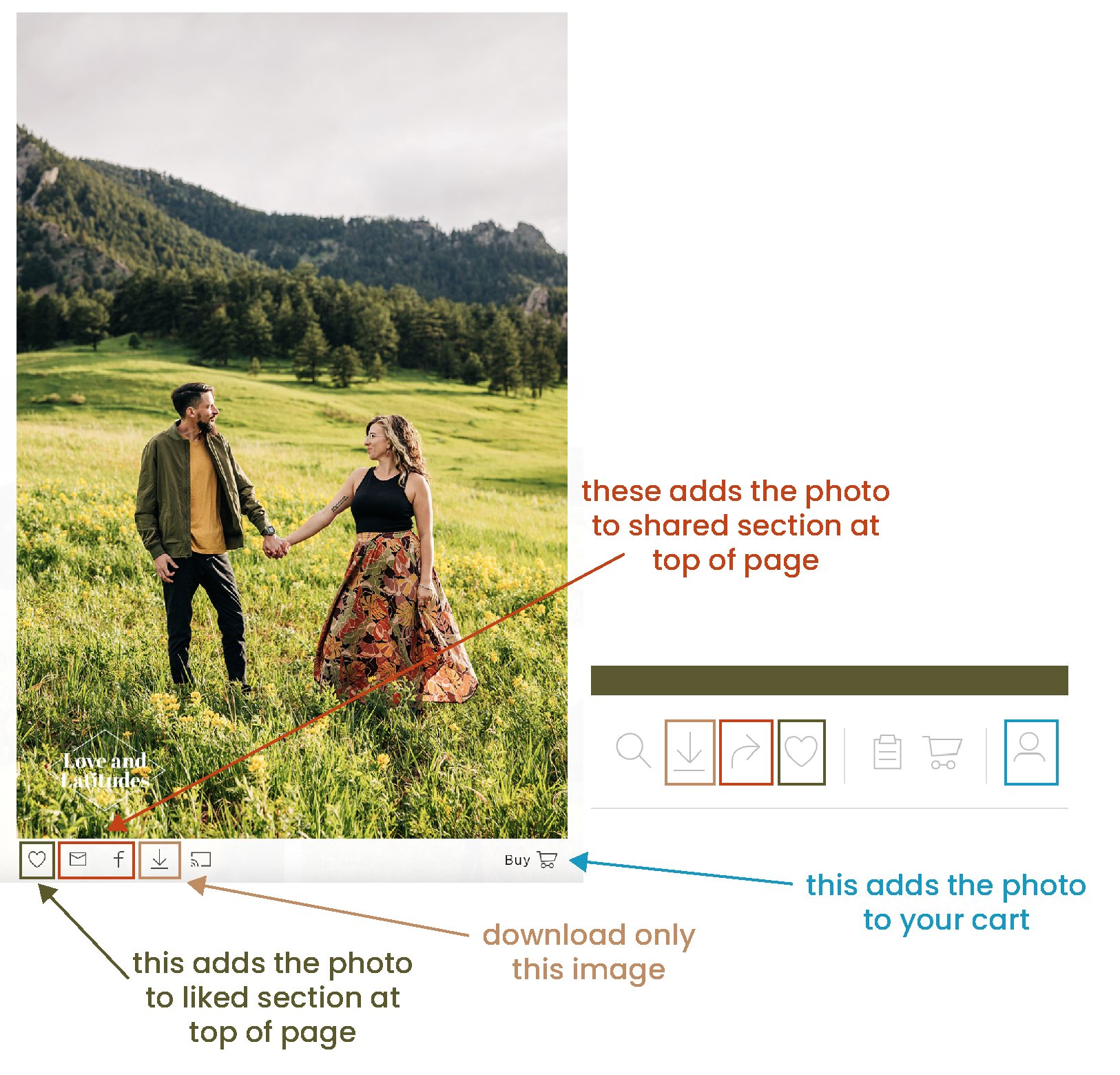 Shopping Cart Icon: This will give you the option to purchase a print or item with this photo.