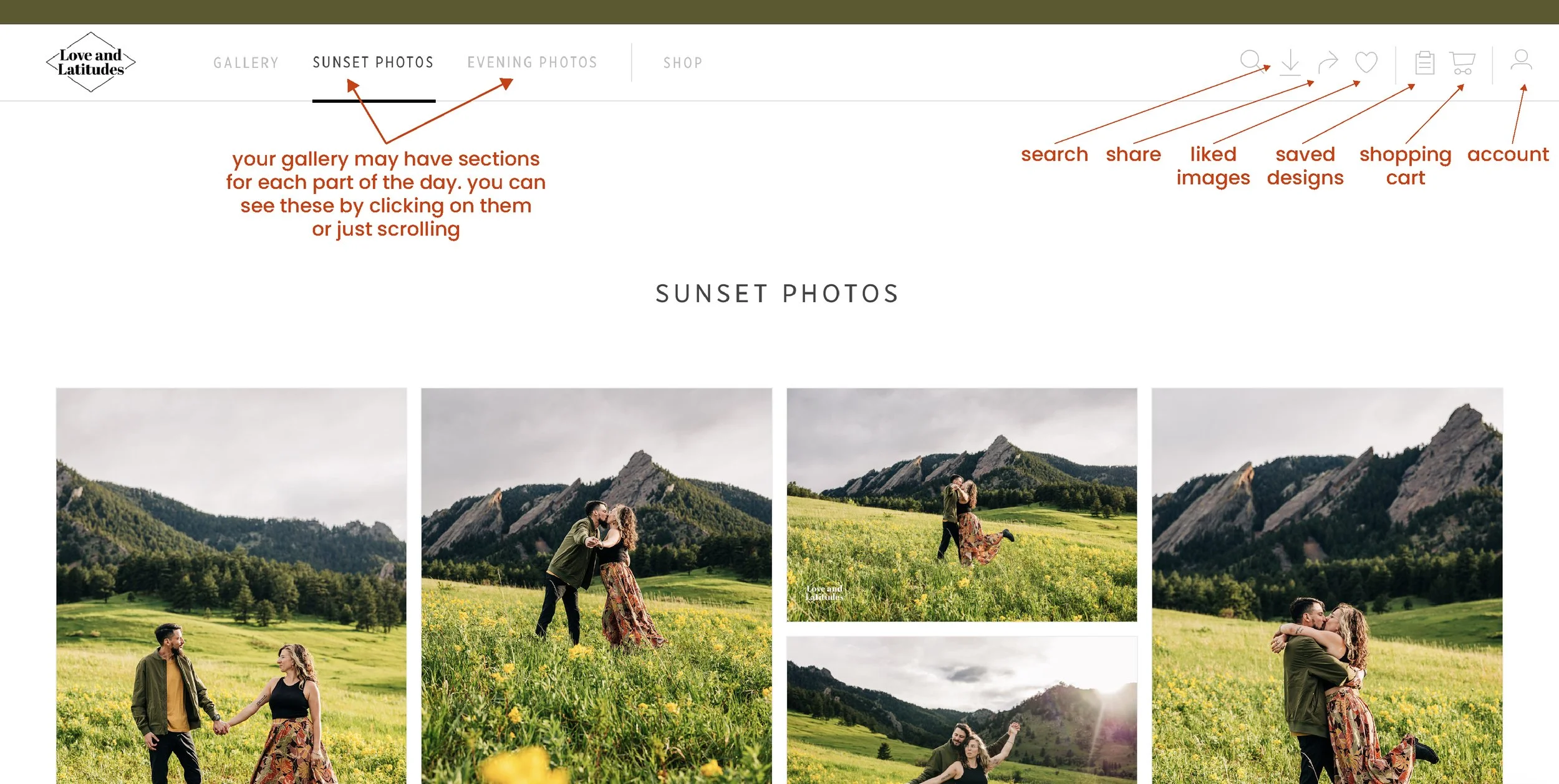 If you click on one photo, you’ll see a watermark and more icons on the images. The watermark is only present in the gallery! Once the photo is downloaded or a print purchased, the watermark will not be visible.